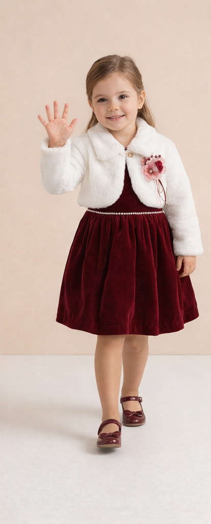 Robe en velours bordeaux au charme intemporel, accompagnée d’un boléro blanc tout doux avec détail floral. Une tenue élégante et raffinée, idéale pour les fêtes et les grandes occasions.