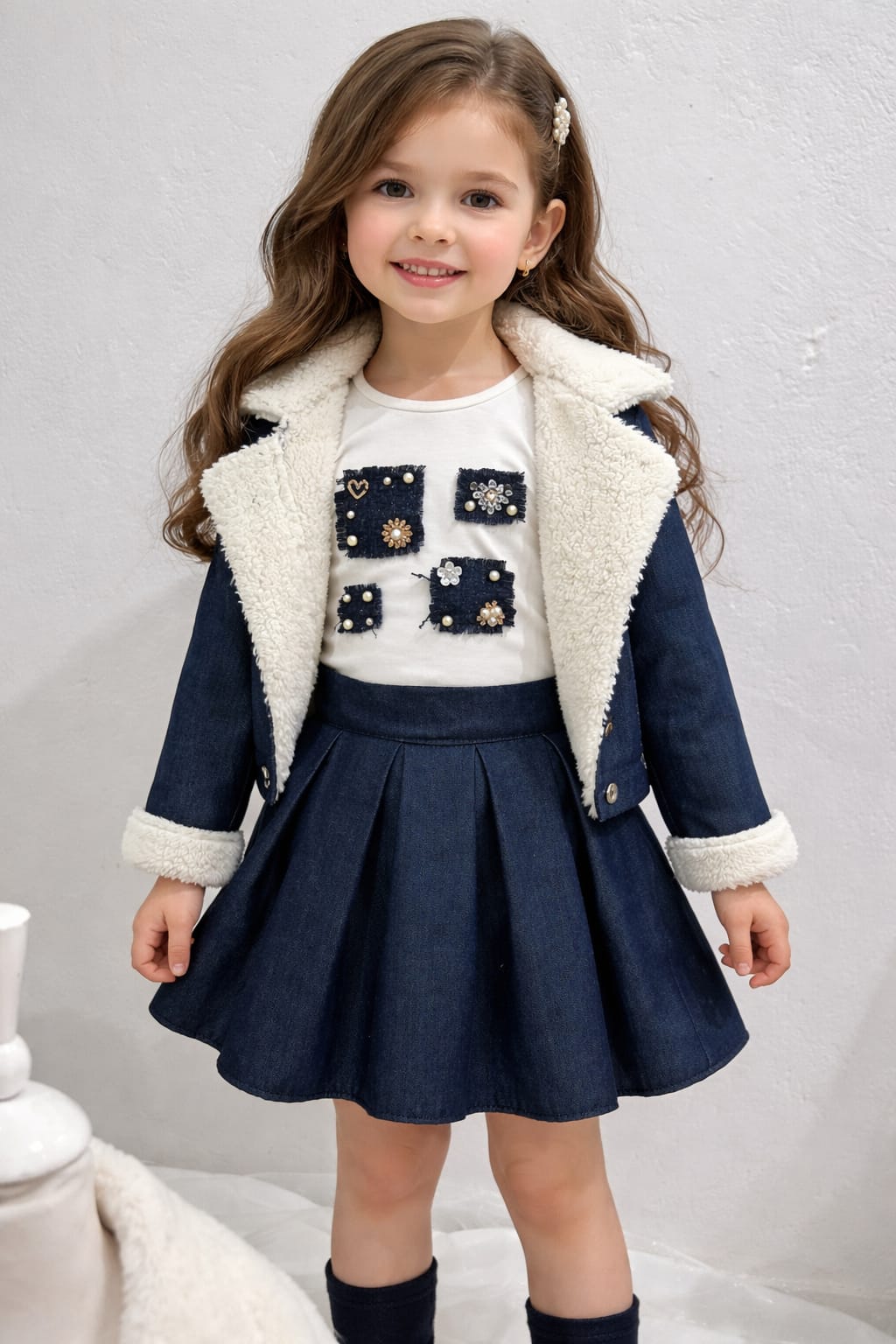 Un ensemble chic pour fillette combinant une veste en denim bleu foncé doublée de fausse fourrure crème avec un haut blanc orné de petits carrés décoratifs et une jupe évasée en jean assortie. Parfait pour un style casual‑chic qui allie confort et élégance lors des sorties quotidiennes ou des occasions spéciales.