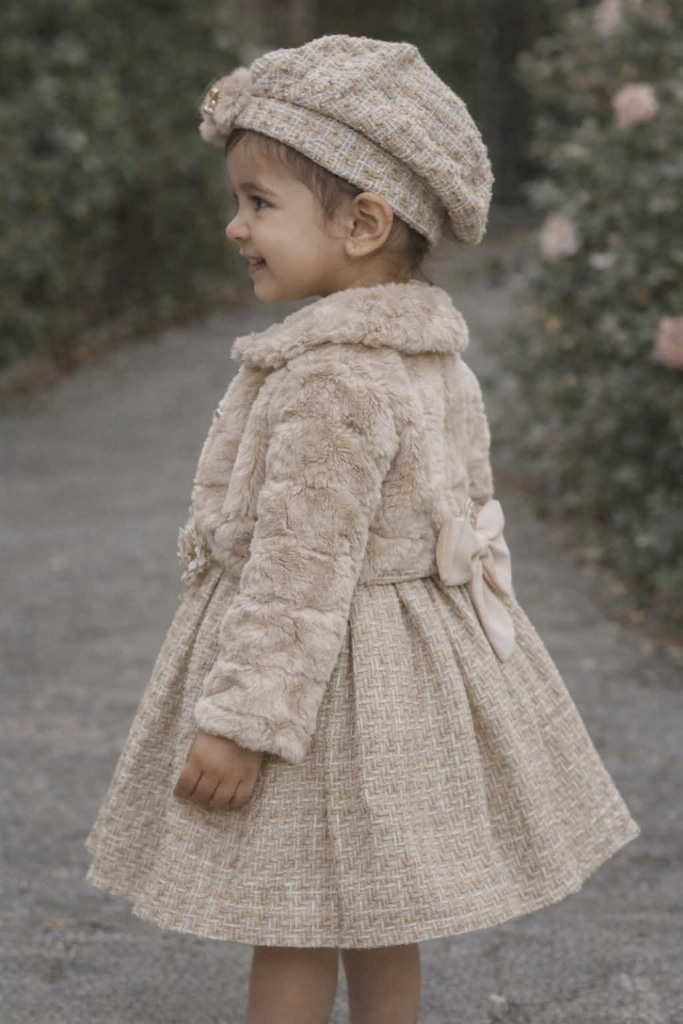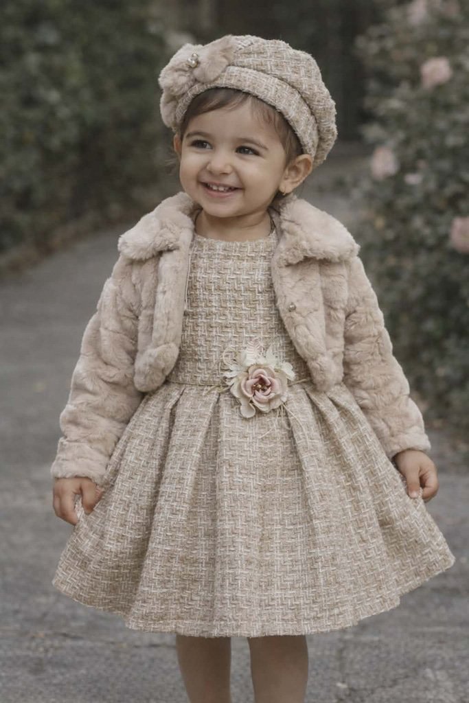 Robe élégante en tweed beige avec détail fleur à la taille, accompagnée d’une veste douce en fausse fourrure et d’un béret assorti. Un ensemble raffiné et chaleureux, parfait pour les occasions spéciales.