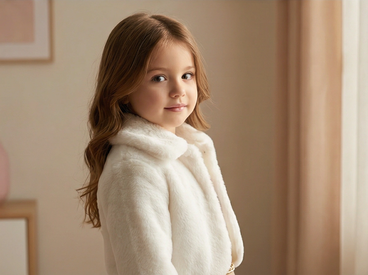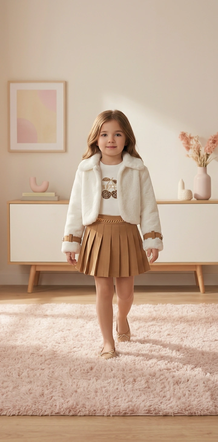 Ensemble fille élégant composé d’une veste douce effet fourrure, d’un pull en coton avec motif, et d’une jupe plissée chic avec ceinture. Un look raffiné et confortable, parfait pour les occasions spéciales comme pour les sorties du quotidien.