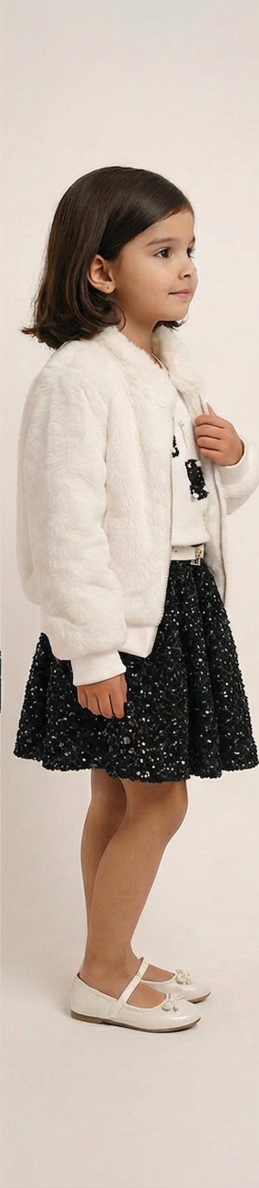 Un ensemble élégant pour petite fille composé d’une veste blanche en fausse fourrure douce, associée à un haut blanc décoré de motifs carrés ornés de sequins et perles. La tenue est complétée par une jupe évasée noire scintillante à sequins avec ceinture assortie, pour une silhouette raffinée et lumineuse.