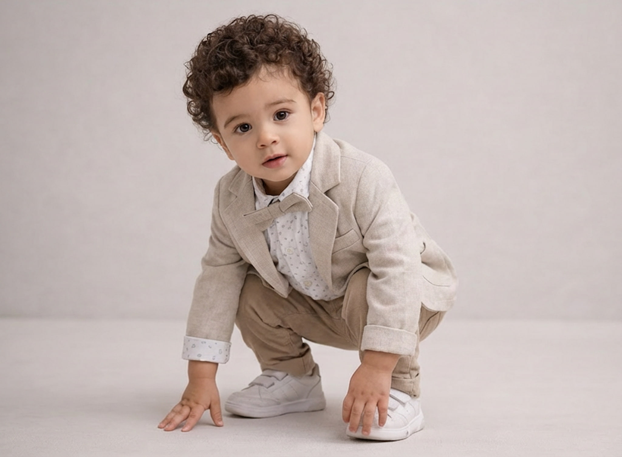 Sublimez votre tout-petit avec cet ensemble habillé garçon idéal pour toute occasion spéciale. Le kit comprend une veste blazer beige, un nœud papillon, une chemise et un pantalon pour un look de fête complet et raffiné.