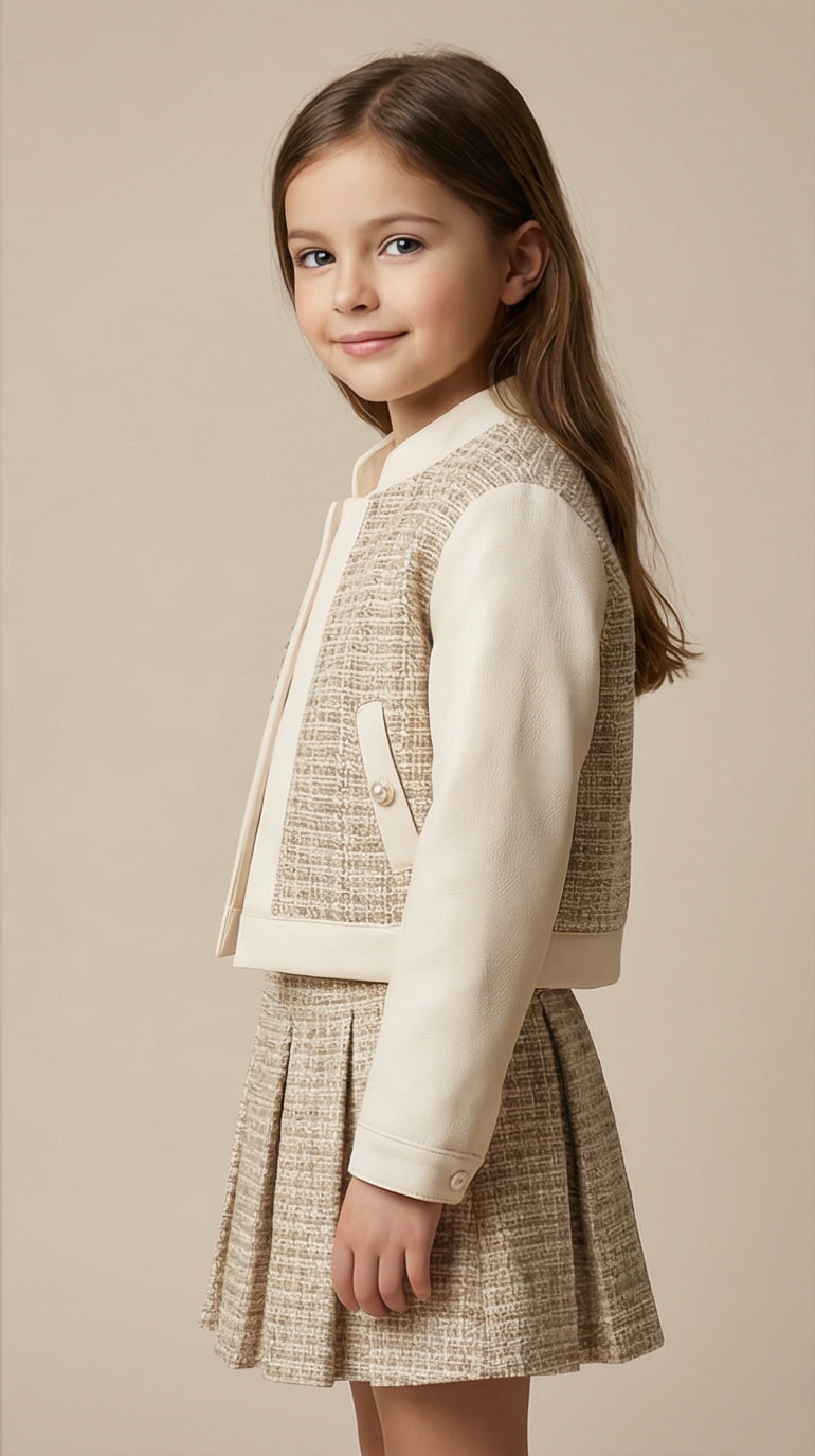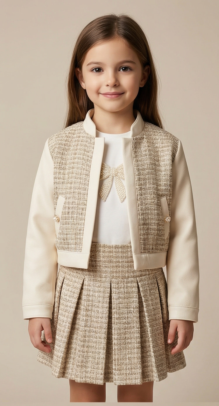 Ensemble élégant composé d’une jupe plissée à motif tweed, d’un t-shirt délicat avec nœud décoratif et d’une veste assortie aux finitions soignées.