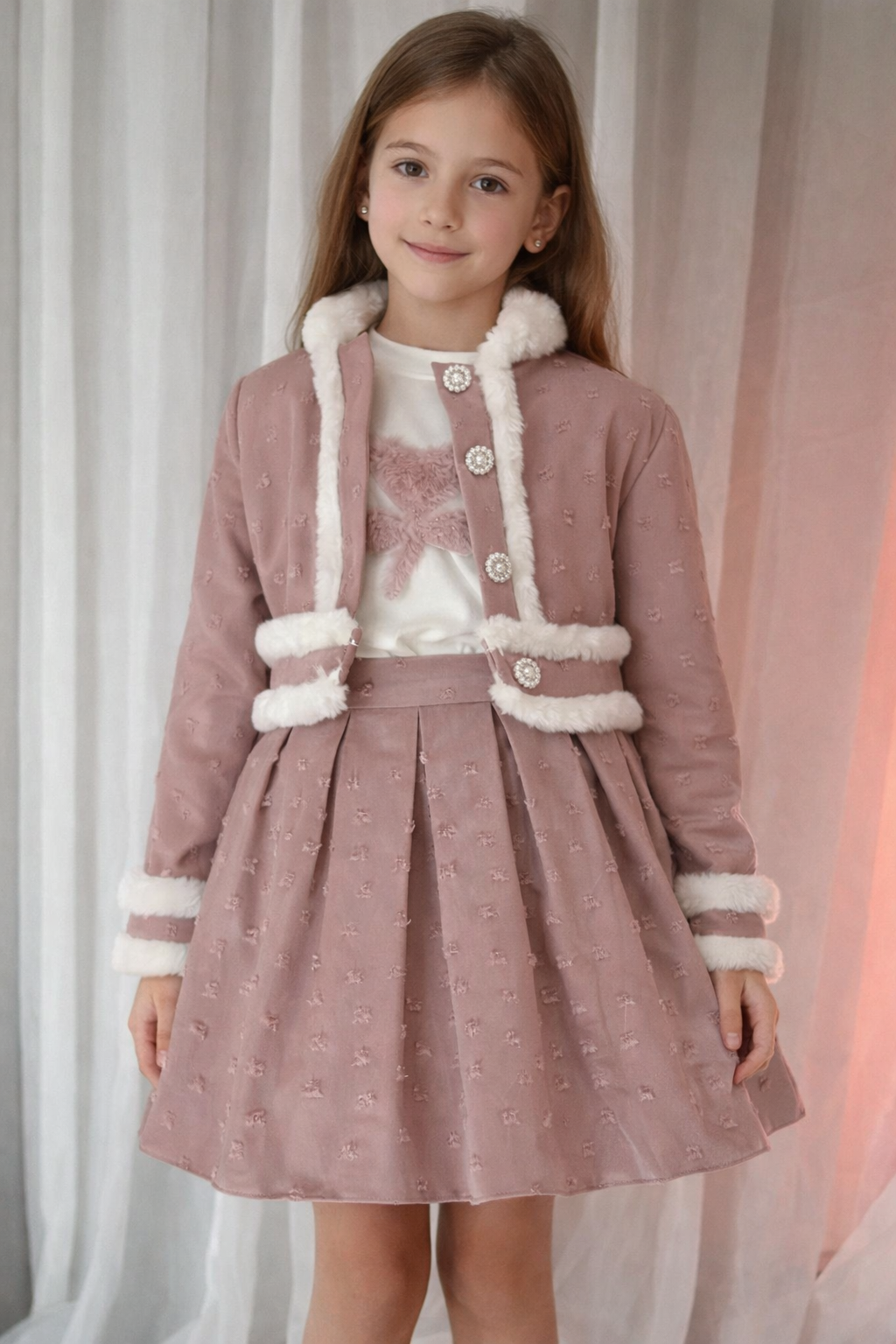 Une tenue chic et raffinée pour fille composée d’une veste rose poudre doublée de fausse fourrure blanche et d’une jupe plissée assortie. Parfaite pour les occasions spéciales ou les sorties élégantes, cette ensemble allie confort, douceur des matières et style intemporel pour un look adorable et soigné.