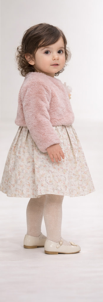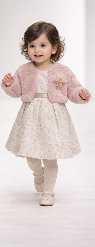 Robe délicate à imprimé floral dans des tons doux, accompagnée d’un boléro rose en fausse fourrure avec détail fleuri. Une tenue élégante et confortable, parfaite pour les cérémonies et occasions spéciales