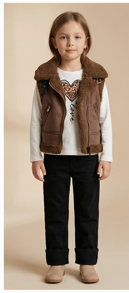 Un look moderne composé d’un gilet sans manches effet suédine doublé moumoute, d’un t-shirt imprimé cœur léopard et d’un pantalon noir élégant. Une tenue parfaite pour un style casual chic, idéale pour les journées fraîches tout en restant ultra tendance ✨