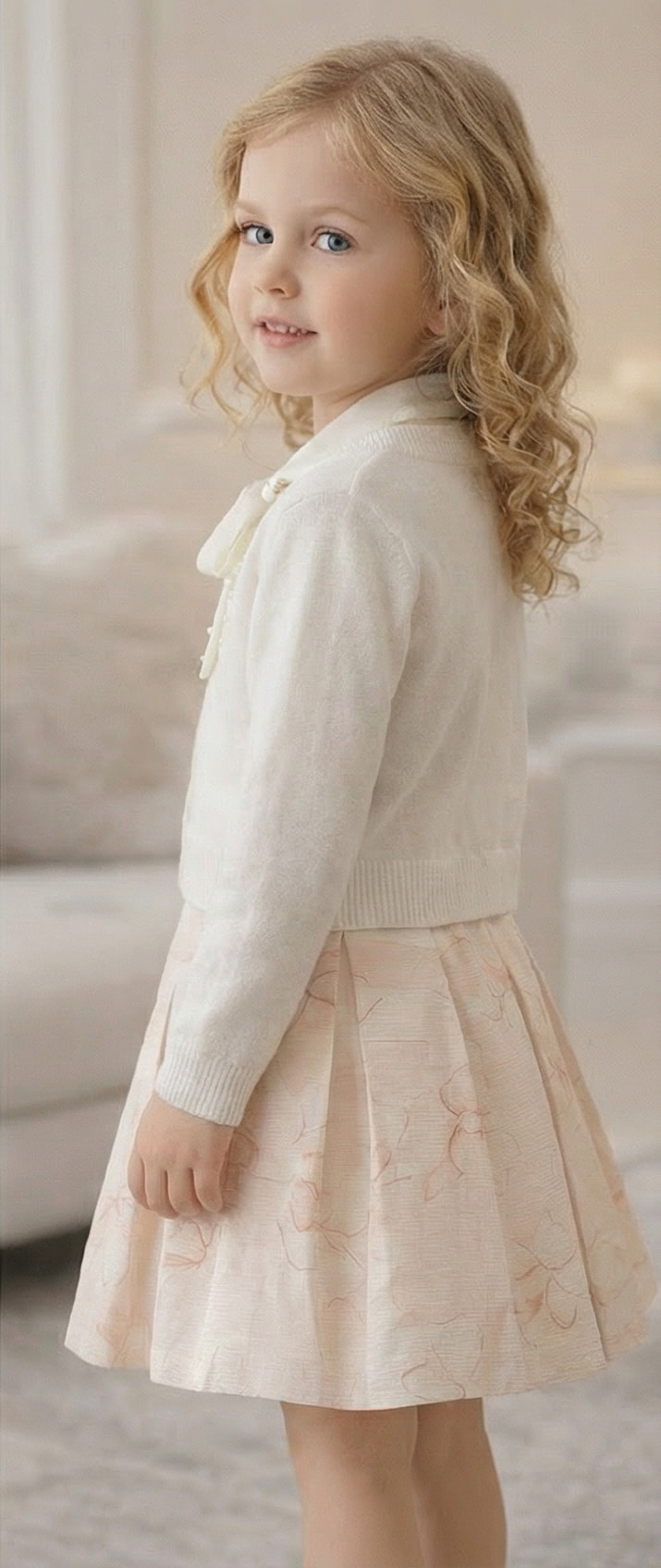 Un cardigan ivoire raffiné porté sur un pull assorti dont le joli nœud vient sublimer l’encolure, associé à une jupe plissée rose poudré aux motifs subtils. Une tenue douce et lumineuse, idéale pour les cérémonies et les moments précieux ✨