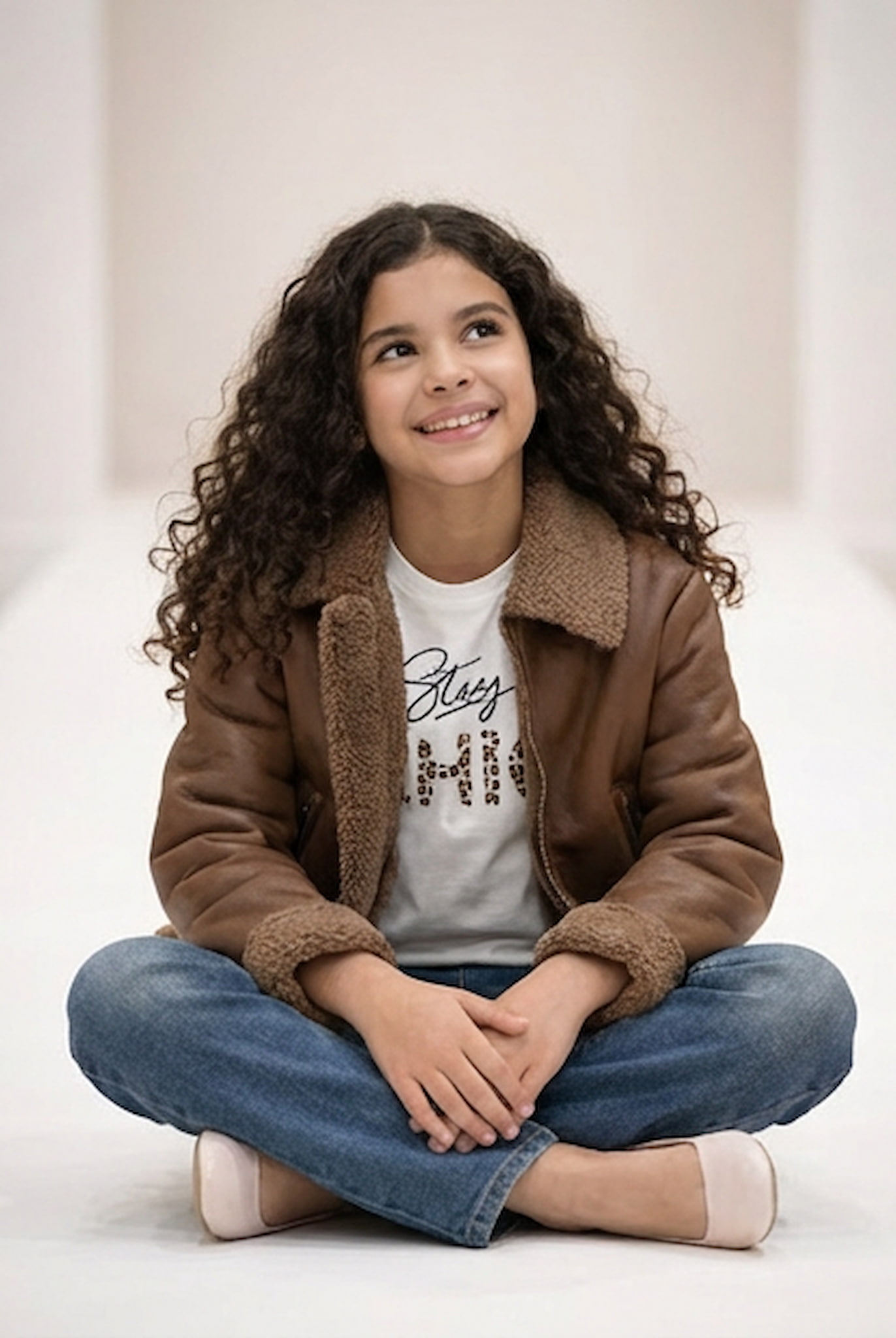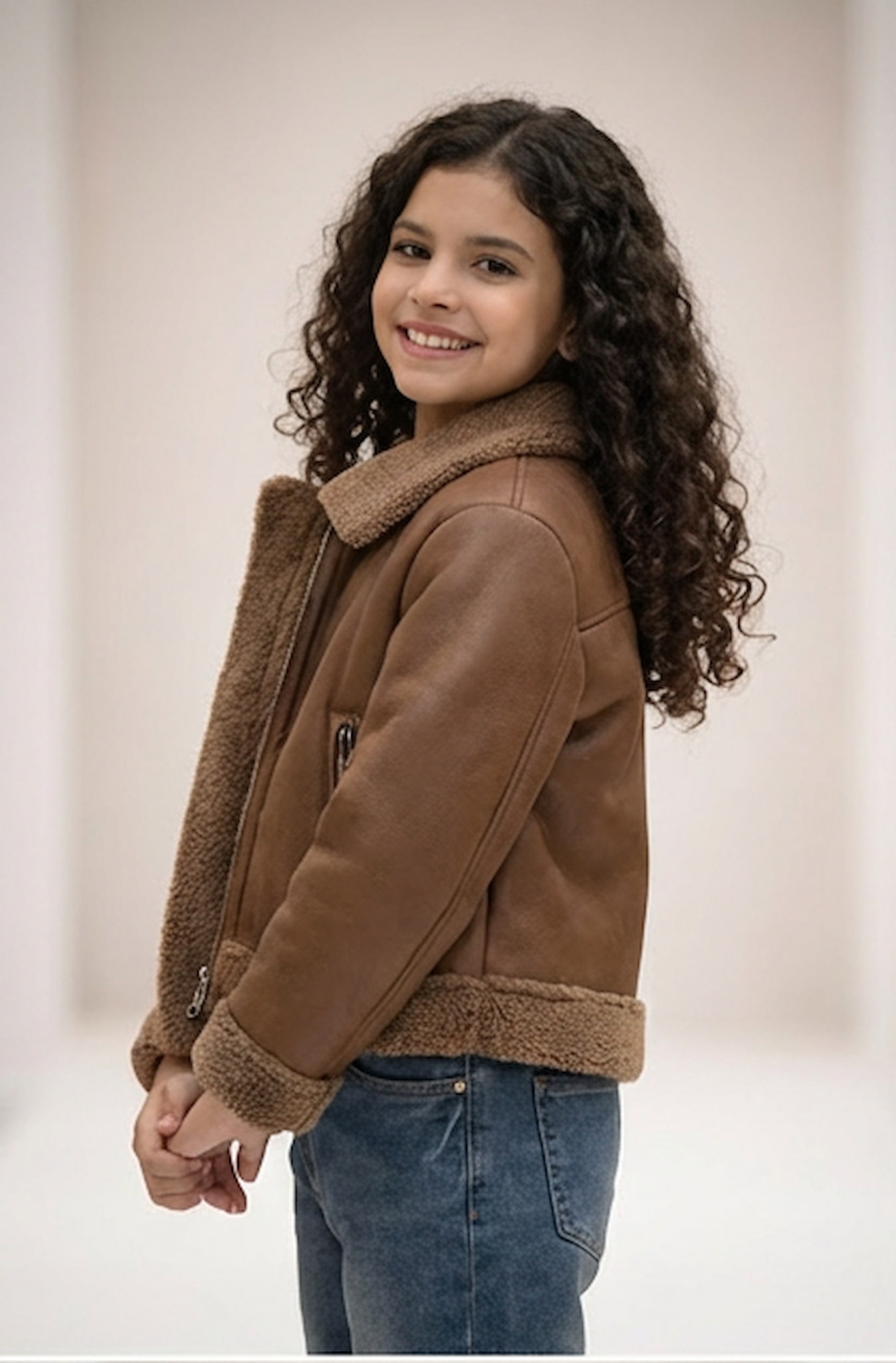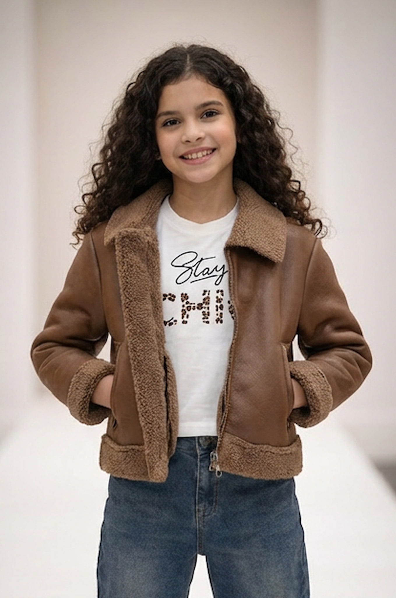 Un look casual chic parfait pour la saison fraîche. La tenue se compose d’une veste marron style aviateur avec doublure effet mouton apparente au col, aux poignets et à la base, apportant chaleur et caractère.