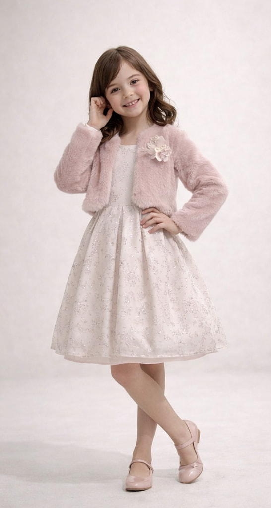 Robe de cérémonie élégante à la coupe évasée, confectionnée dans un tissu délicatement scintillant pour un effet raffiné et lumineux. Elle est sublimée par un boléro court en fausse fourrure rose poudré, orné d’une fleur décorative pour une touche romantique. Une tenue idéale pour les fêtes, mariages et grandes occasions.