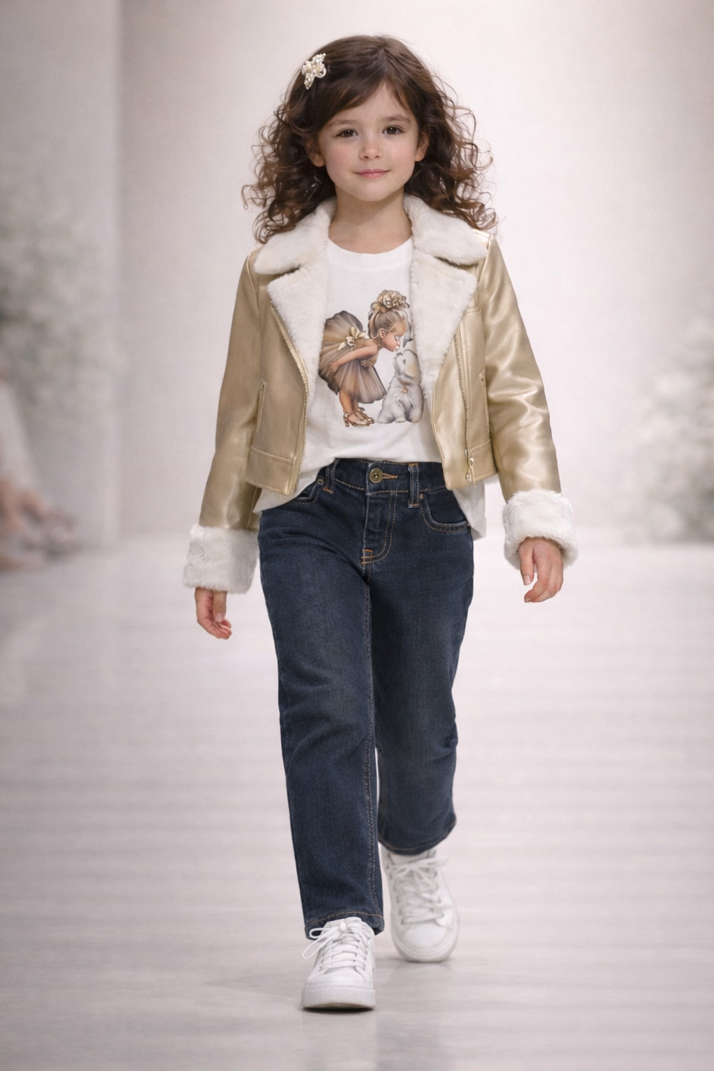 Une tenue kids ultra stylée avec une veste dorée irisée à col et poignets en fausse fourrure blanche, portée sur un t‑shirt à motif mignon et un jean bleu foncé droit. Confortable et facile à associer, ce look est parfait pour les sorties quotidiennes ou les occasions casual avec une touche de modernité.