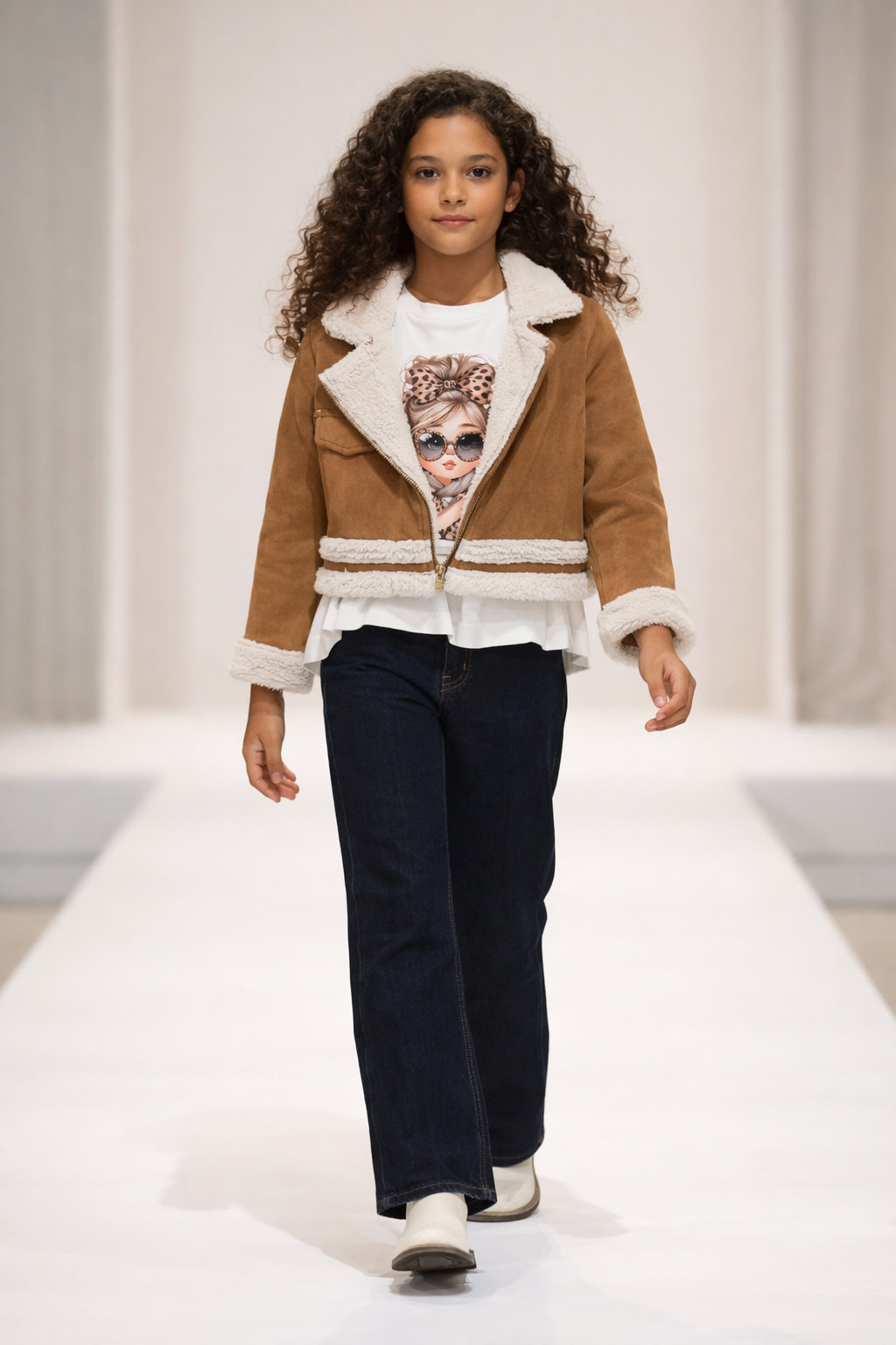 Un ensemble mode idéal pour les journées fraîches : une veste style aviateur en suédine camel avec intérieur sherpa doux, associée à un haut blanc à motif tendance et un pantalon jean foncé droit. Une silhouette casual‑chic qui allie confort et style pour les sorties ou les occasions décontractées.