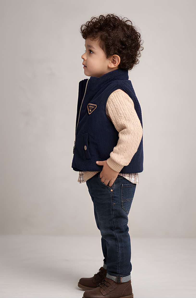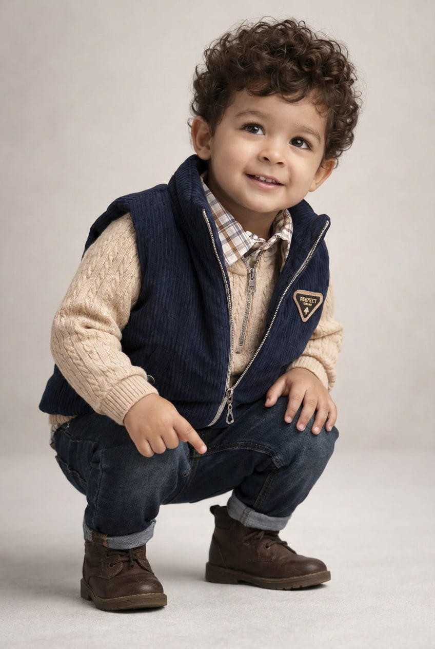 Un look élégant et confortable composé d’une chemise à carreaux superposée à un pull en maille douce, associé à un jean tendance et une veste sans manches en velours côtelé. Parfait pour les sorties, les occasions spéciales ou un style casual raffiné au quotidien.