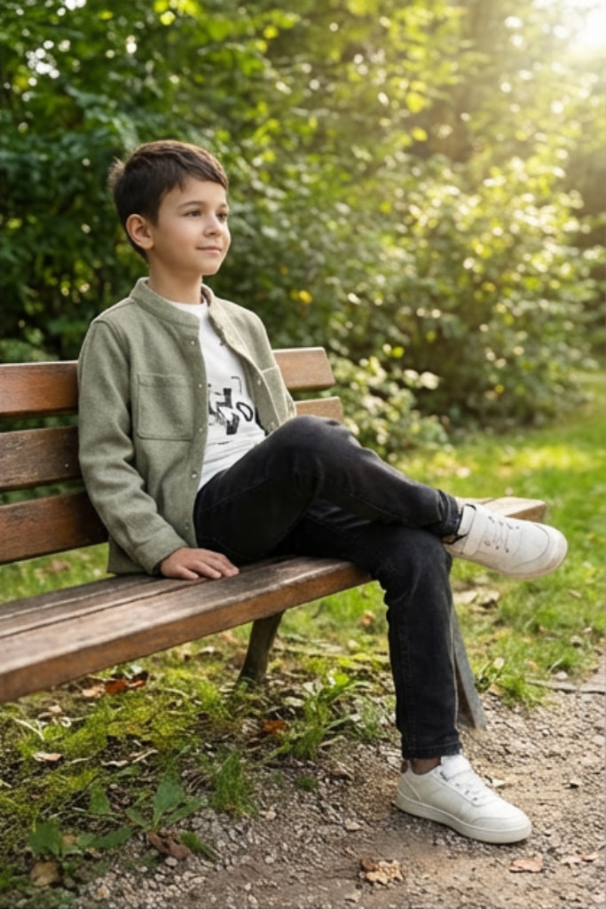Adoptez ce look décontracté avec cet ensemble 3 pièces pour garçon. Il comprend une surchemise verte boutonnée tendance, un t-shirt blanc imprimé graphique et un jean foncéconfortable. Une tenue parfaite pour les balades de mi-saison.