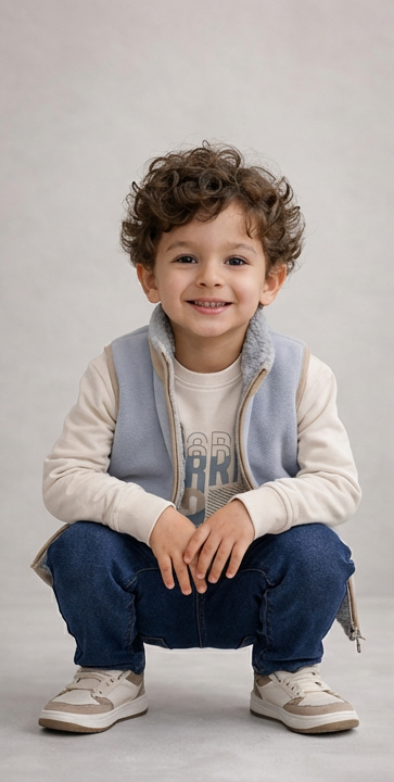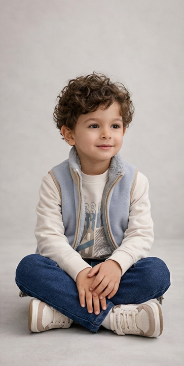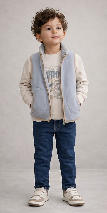 Une tenue confortable composée d’un sweat imprimé aux tons neutres, d’un jean classique et d’une veste sans manches zippée doublée effet mouton pour plus de chaleur. Un look pratique et élégant, parfait pour les journées fraîches et les sorties en famille.