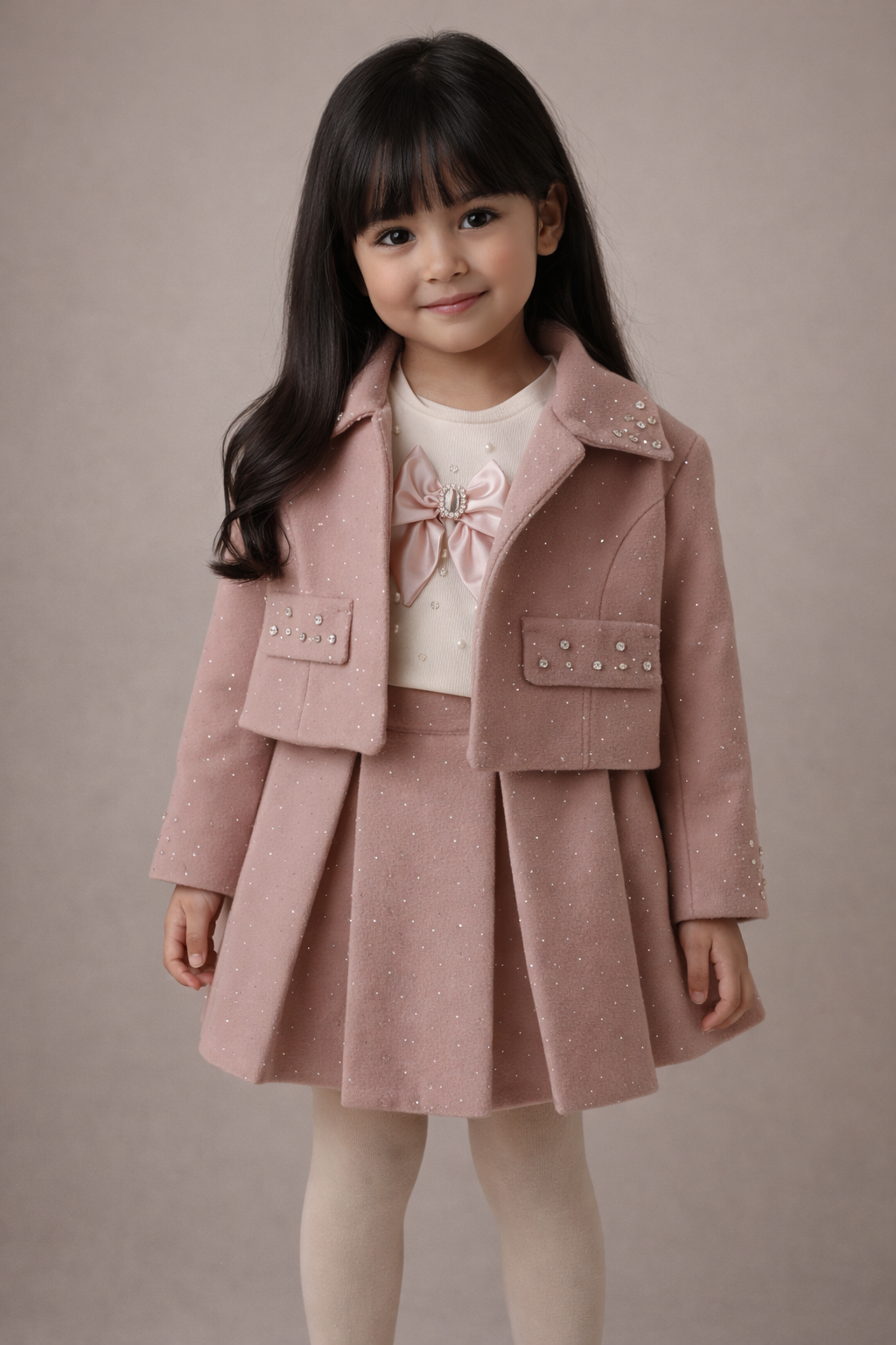 Un ensemble élégant pour fille junior composé d’une veste courte rose poudré avec détails brillants, d’un haut crème orné d’un nœud satiné et d’une jupe plissée assortie. Idéal pour les occasions spéciales ou les sorties en famille, cet ensemble marie tendance et raffinement pour un look sophistiqué et adorable.