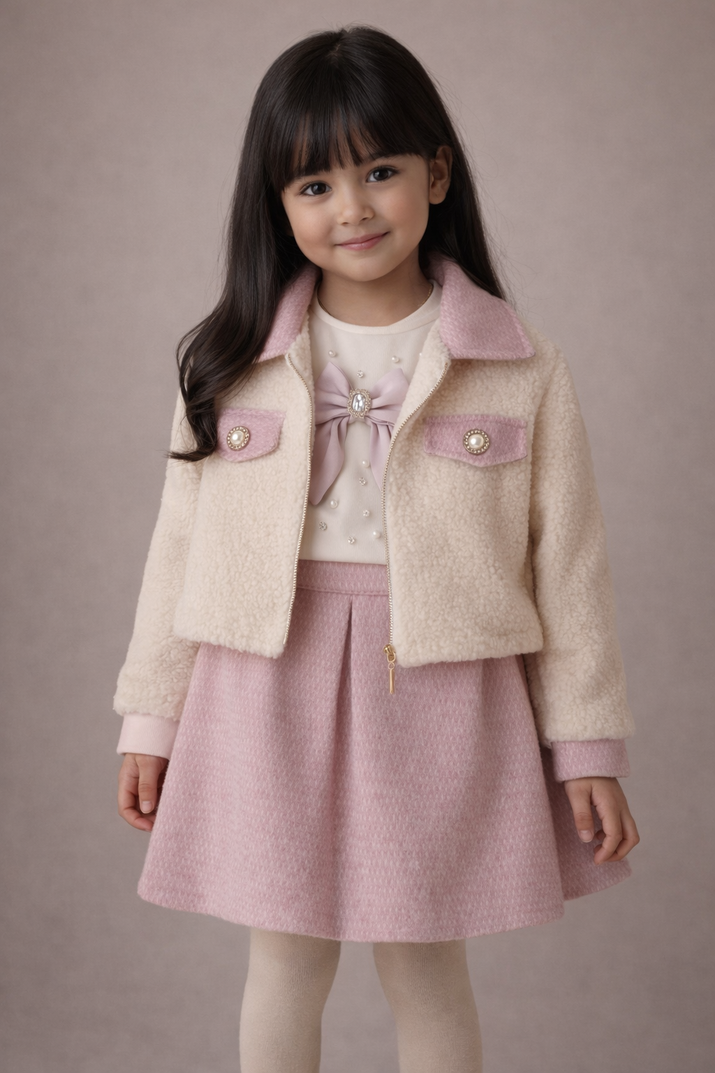 Offrez-lui un style raffiné avec cet ensemble coordonné pour fille junior, comprenant une veste douce crème avec col lilas et poches décoratives, un haut crème orné d’un nœud lilas tendance, et une jupe rose pastel fluide. Idéal pour les occasions spéciales, les sorties en famille ou pour un look chic au quotidien, ce set allie confort et sophistication.