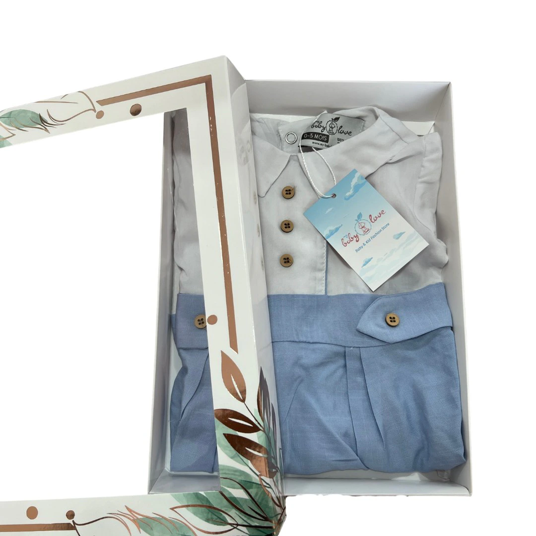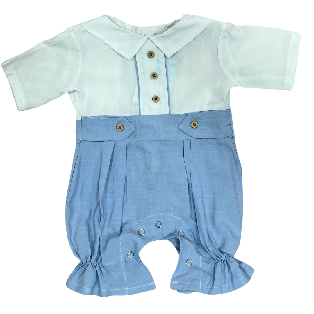 Barboteuse à manches courtes de couleur bleu pour nouveau-né. Fermeture à bouton sur le dos pour faciliter le passage du vêtement. Tissu de lin d’aspect frais et actuel. Existe en plusieurs tailles : de 0-3 mois à 18-24 mois.